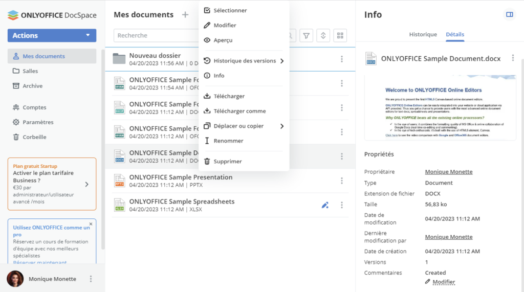 ONLYOFFICE DocSpace est proposé en deux tarifs – un plan Startup gratuit et un abonnement professionnel.