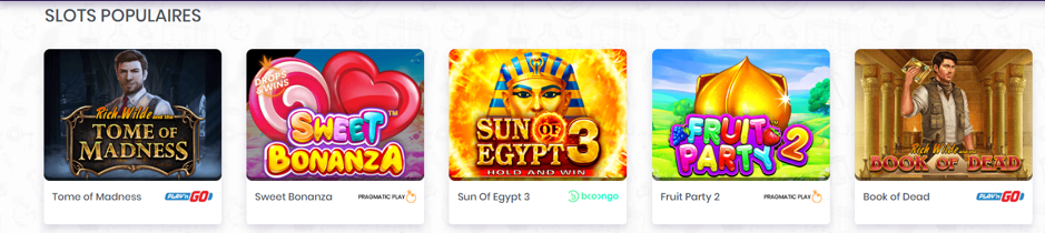 La plateforme a visé très haut avec une ludothèque digne des plus grands. On retrouve plus de 1000 jeux dont les machines à sous qui constituent la grosse majorité de l’offre. Vous aimez les jackpots ? Pas de souci, vous êtes au bon endroit : le casino en ligne a prévu plusieurs dizaines de titres pour mettre le feu aux poudres et vous permettre de gagner gros. Parmi les machines à sous phares, on retrouve :