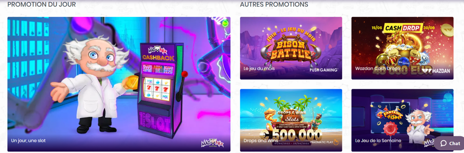 - 💰 Un Jour, Une Slot : tous les lundi et mercredi de la semaine, de 10 h à 23h 59, recevez 20 à 30 % de cashback sur les nouveaux jeux du catalogue. Le cashback est versé sur votre compte joueur le lendemain avant 19h.